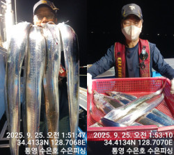 반갑습니다통영 수 은 호 입니다20일 입항 갈치 조황입니다씨알 좋아요~개인 사진 저장은 수은호 밴드에서 하시면 됩니다출조하신 조사님들 수고하셨습니다~^^** 출조하시는 조사님들께서는 "오후1시까지" 오십시요 (1시 추첨합니다~) ** 기상만 좋으면 출항 합니다~^^ ** 예약은 010 3361 4231 전화주세요~ ** 14석으로 넓고 편하게 갈치 낚시 하러 오세요~ ** 외부어탐모니터 설치** 주차는 수은호 선상 앞 우성수산 마당에 주차 하시면 됩니다 수은호 전용 주차장 있습니다. (CCTV녹화중)** 21일(일) 갈치 기상악화** 22일(월) 갈치 기상악화** 23일(화) 갈치 자리여유** 24일(수) 갈치낚시대회 완료*** 25일(목) 갈치 자리여유** 26일(금) 갈치 예약완료*** 27일(토) 갈치 예약완료*** 28일(일) 갈치 자리여유** 9월 24일은 갈치 낚시대회 개최합니다(예약완료) 참가비 26만원입니다 상금과 상품이 많이 준비되어 있습니다~^^** 예약은 010 3361 4231** 채비문의는 010 8554 4231 전화주세요** 위치는 통영시 미우지해안로 123-1 미수항입니다** 수은호 계좌번호 입니다 수협 2020 4635 0530 이종의 수은호입니다** 예약은 선입금 후 예약 진행 됩니다 ** 갈치 출조하실 조사님께서는 오후 1시까지 오십시요~** 4인단체이상 한줄로 자리 선택 가능~** 갈치출조시에만 잠자리 지정입니다 (1~7번 상선실, 8~14번 하선실)** 승선인원 총 22명(선장,자무장포함)(9.77톤)** 옆에분들께 피해 주시는 행동은 삼가해 주세요.** 장비 대여시 미리 말씀 부탁드립니다 (낚시대세트대여 2만원,쿨러 아이스박스포함 1만원) ** 조식은 제공하지 않습니다** 신분증,구명조끼,멀미약,장갑,칼은 필수입니다** 구명조끼 미착용시 벌금 있습니다** 선상에서 음주 금지,적발시 벌금 있습니다** 하선시 본인 물건 잘 챙기세요** 제로쿨 예약 010 9425 4123 ** 수은호를 찾아 주시는 모든분들 감사합니다~~^^*** 통영 수은호 예약 안내 ***예약문의 : 010-3361-4231오시는길 : 경상남도 통영시 미우지해안로 123-1홈페이지 : http://sooeun.sunsang24.com/